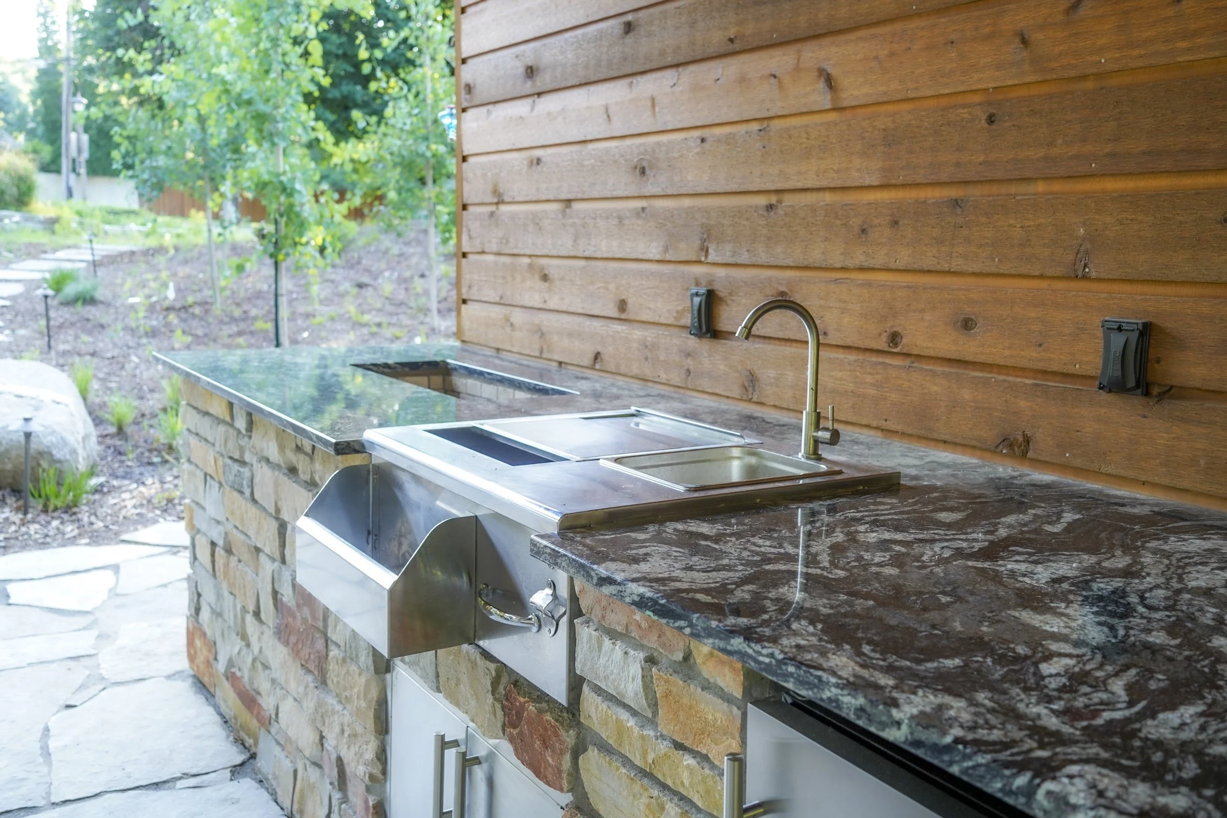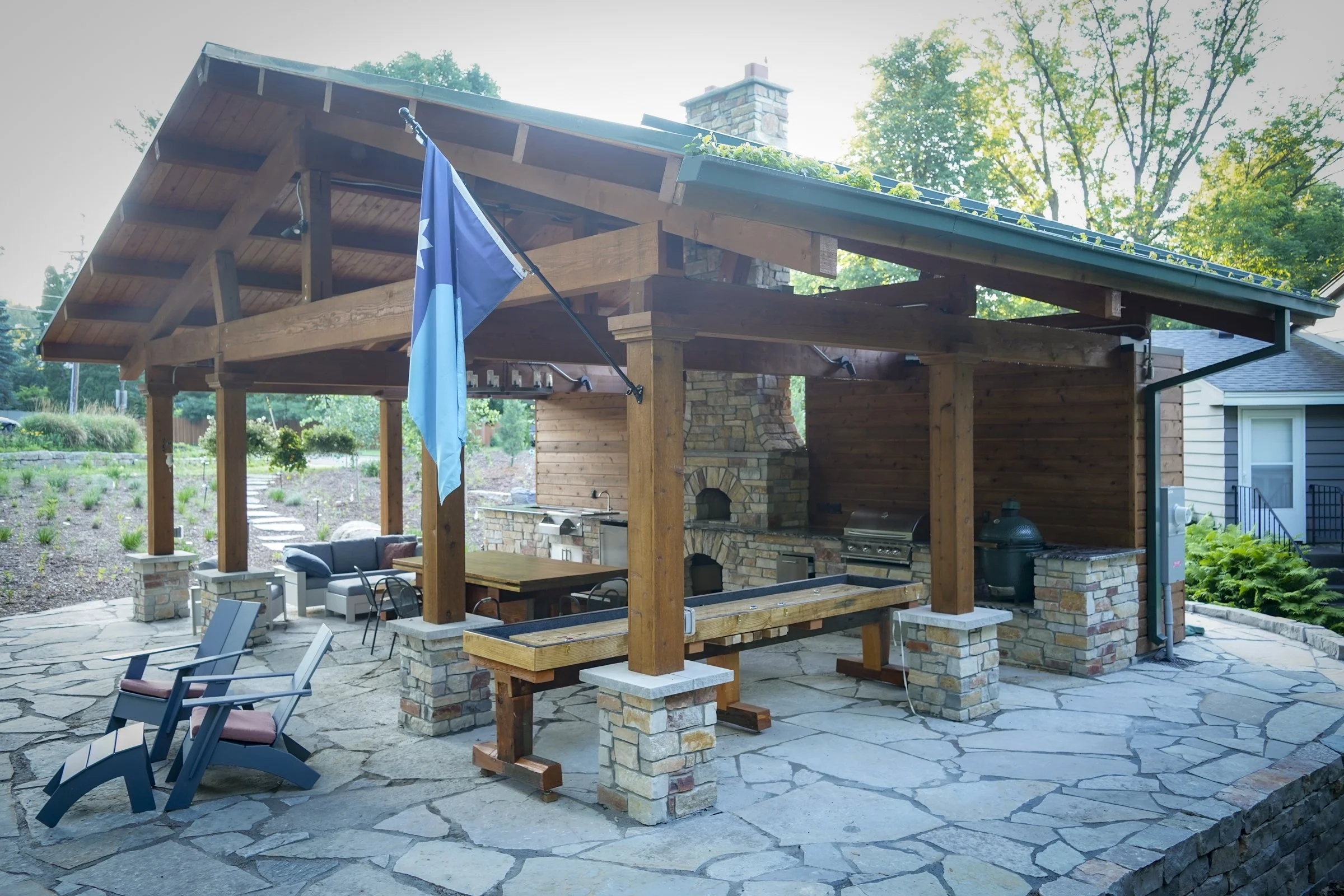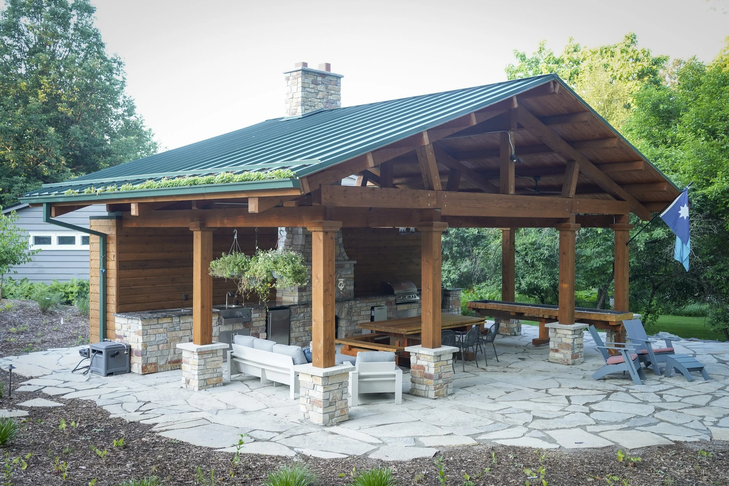 This project presented the opportunity to really maximize outdoor living space on a lovely lot in Highland Park. The owners’ goal was to create a family relaxing and entertaining space with a wood-fired pizza oven, grill, smoker, and various gaming opportunities. We were able to re-purpose the old-growth Douglas fir beams from the house that formerly stood on the lot, along with some beautifully figured ash (also from an on-site tree that we had felled, rough-sawn into boards, and kiln-dried) to make a dining table, benches and and a combination shuffleboard/carpet ball table. Our own Daniel Koplin is the master furniture builder who designed and built the furniture - he loves these kinds of projects, so please ask if you have any custom furniture in mind! The storage lockers on the back of the structure conceal an outdoor ping-pong table that can be rolled out, and the owners also installed a pickle ball/basketball court along with gardens and a fire pit on the property. This project was a collaboration with Light Dark Landscape.
