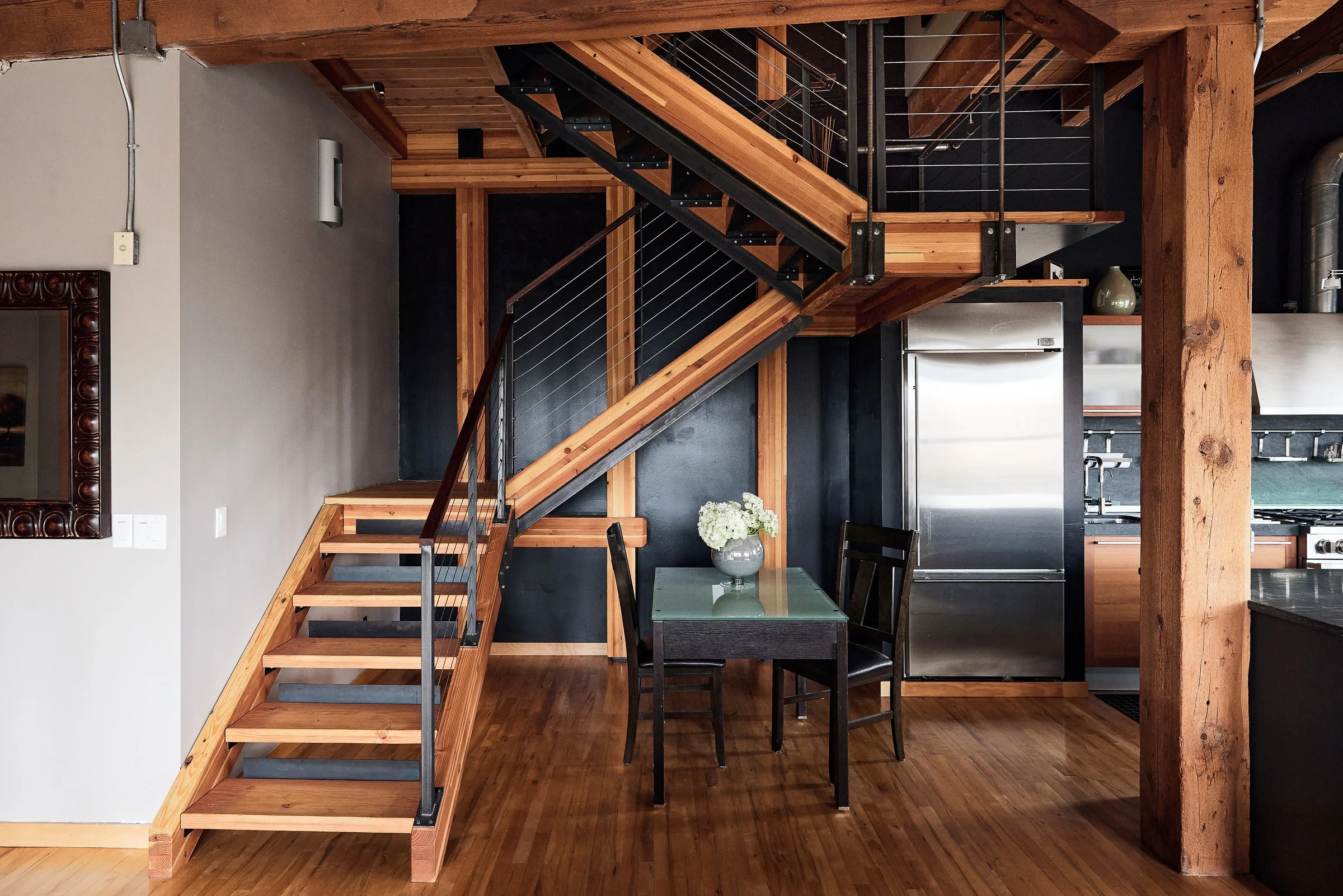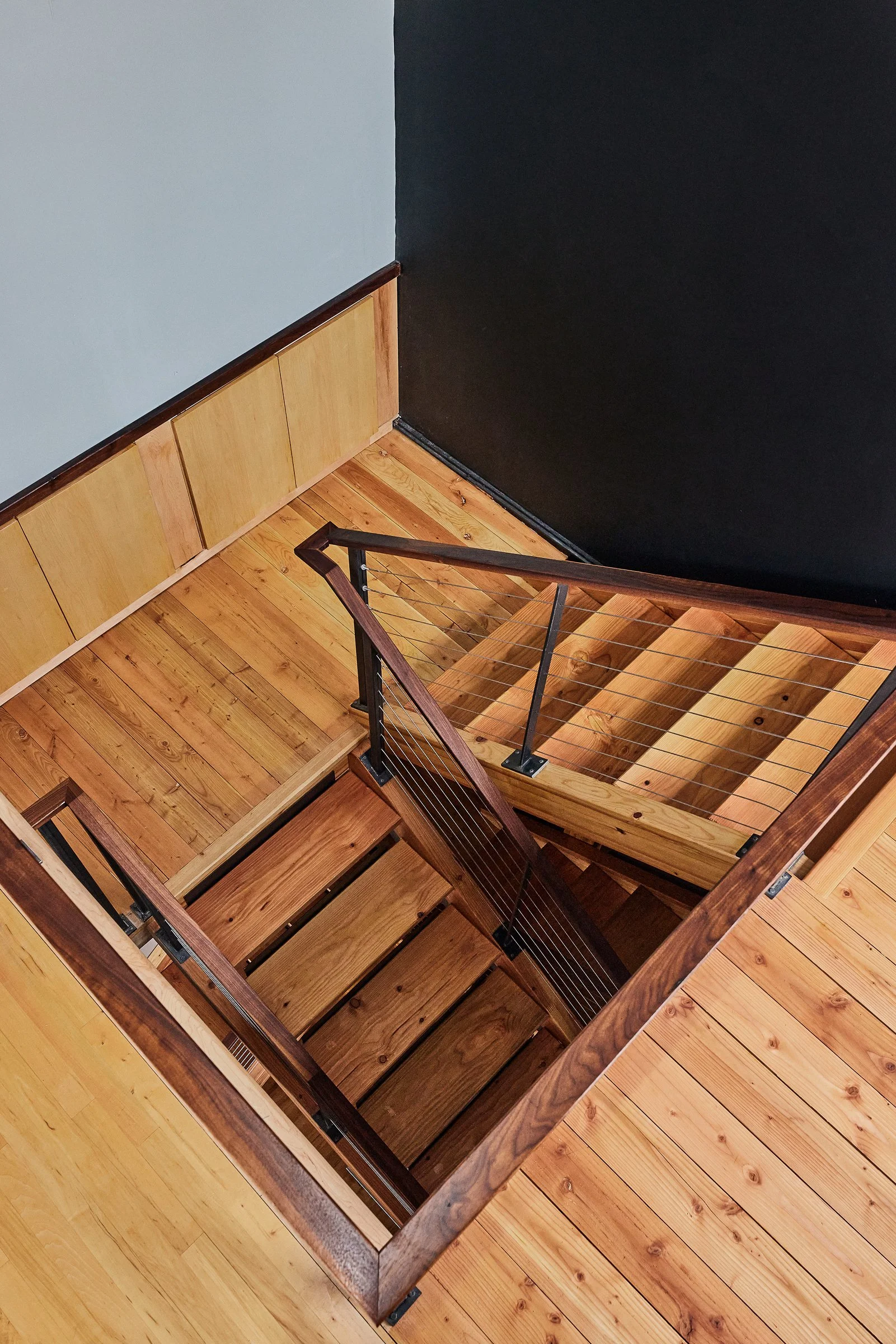 Architect Mark Tambornino of Albertsson Hansen Architecture designed this beautiful steel and Douglas Fir staircase to replace the awkward spiral stair that had been installed in the owner’s historic downtown Minneapolis loft. The spiral was uncomfortable to walk and forget about moving items up and down it - they had to crane the bed in through the upper level exterior door. The design solved a practical problem also completely changed the overall feel of the space. We’re lucky to have both the master carpenter and top notch steel fabricator that could make something so beautiful on our team.